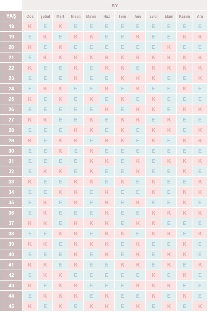 Pervin Hanım o durum şöyle hesaplanıyor: Doğum tarihiniz 15 Nisan 1979 olarak varsayalım, 35 yaşındasınız, yaşınıza 1 ekleniyor 36. Takvime bakarken 14 Nisan’a kadar 36 yaş geçerlidir (yani erkek), 15 Nisan ve sonrası için takvimden 37 yaşına bakmalısınız ki 37 yaşında Nisan ayı kız görünmektedir. 14 Nisan’a kadar erkek, 15 Nisan’dan sonra kız olarak görünüyor. Çünkü yaşınız değişiyor.